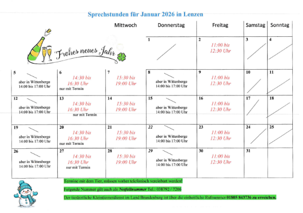 Sehr geehrte Patientenbesitzer, aus den folgenden Dokumenten können Sie alle Änderungen der Sprechzeiten im Januar entnehmen.