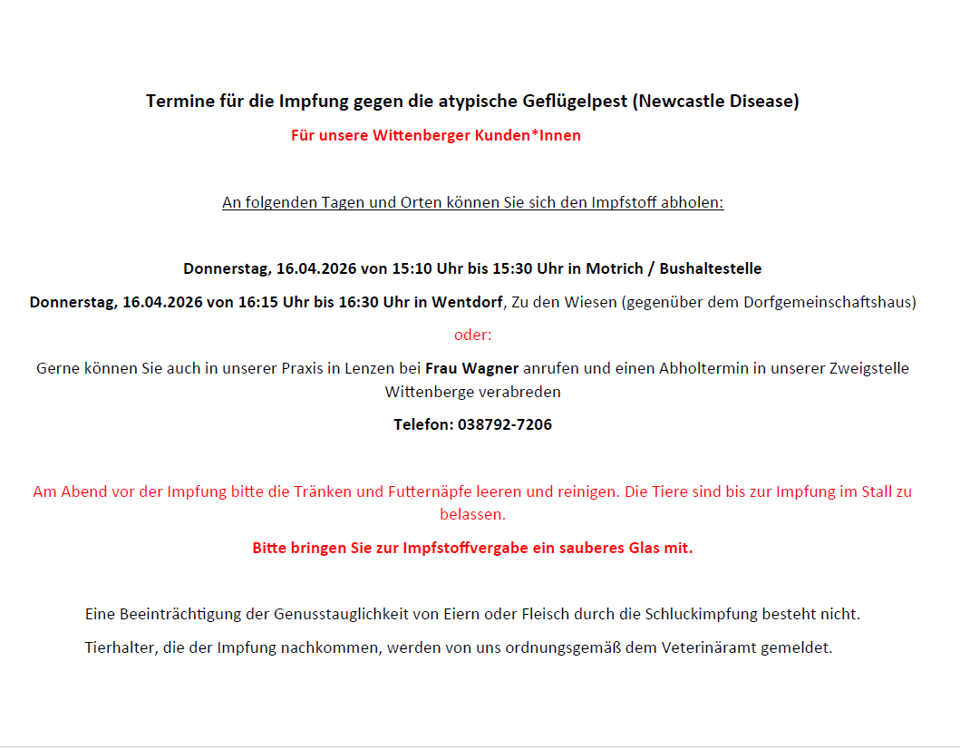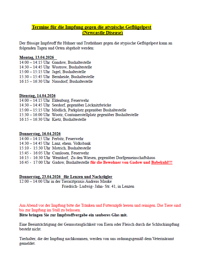 Termine für die Abgabe vom Impfstoff gegen die atypsiche Geflügelpest.
